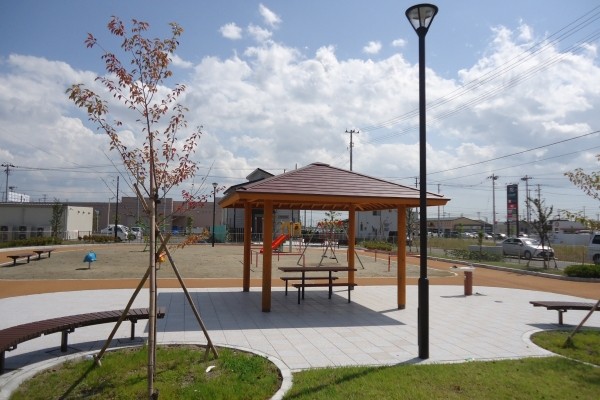 仙台駅から東に5kmほど行った場所にある荒井西土地区画整理事業によって誕生した新しい街です。ここは東日本大震災で被災された方々の防災集団移転地域に指定されています。その街の中には住民の方々の憩いの場となる公園も数箇所設けられ、各公園に当社の様々な形状の東屋を納入させていただきました。