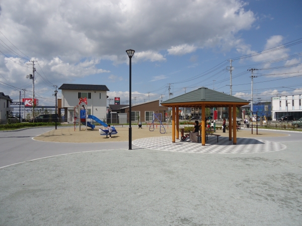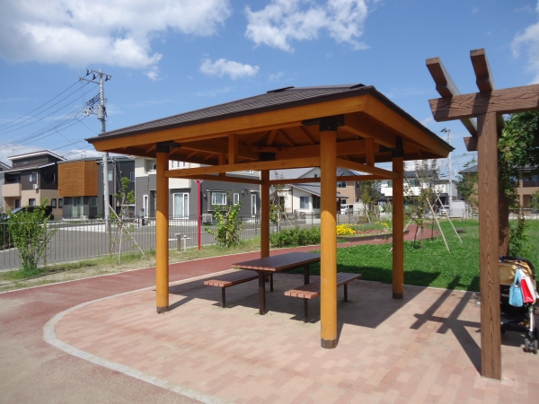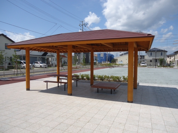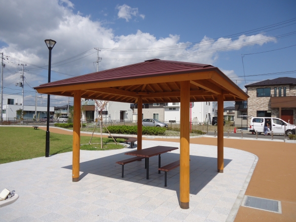 仙台駅から東に5kmほど行った場所にある荒井西土地区画整理事業によって誕生した新しい街です。ここは東日本大震災で被災された方々の防災集団移転地域に指定されています。その街の中には住民の方々の憩いの場となる公園も数箇所設けられ、各公園に当社の様々な形状の東屋を納入させていただきました。