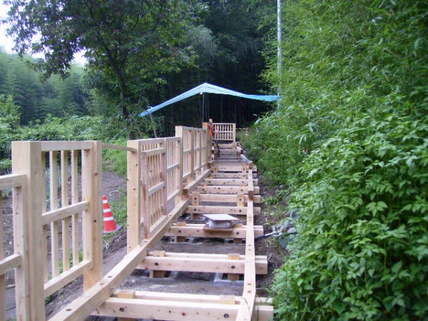 群馬県高崎市にある上野三碑。上野三碑は点在する三つの石碑(山上碑、多胡碑、金井沢碑)の総称で、飛鳥時代から奈良時代にかけて建てられ、国の特別史跡に指定されています。その上野三碑を広く知ってもらうための整備が行われ、当社では金井沢碑への散策路に木道を整備しました。