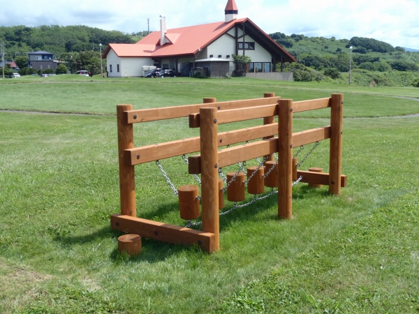 広大な緑地広場にの緑に木製遊具の風合いがなじみます。