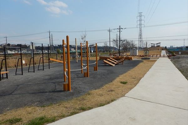 公園の再整備に当り、ロープを渡ったり、板の上を飛んで渡るアスレチック遊具や、腹筋などの運動ができる健康器具、渡し舟に由来した舟型のベンチを設置しました。