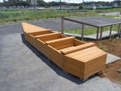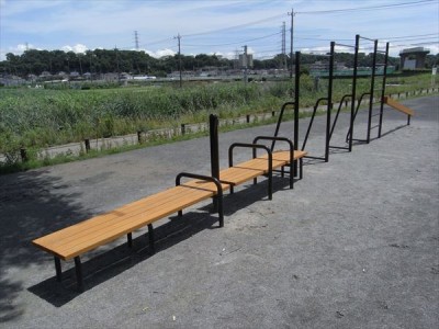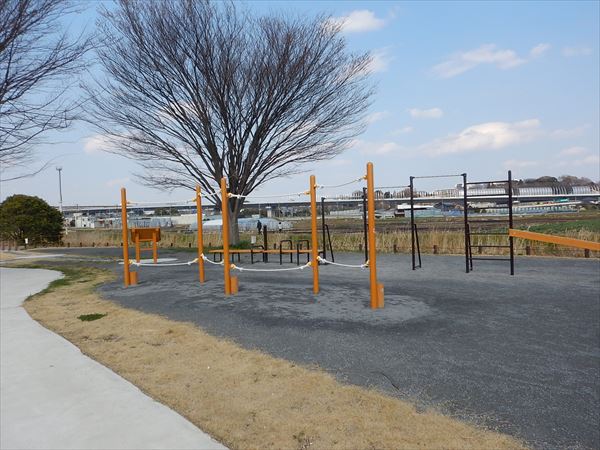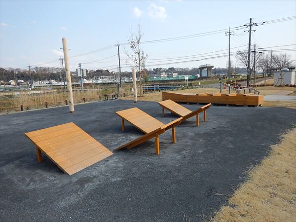 公園の再整備に当り、ロープを渡ったり、板の上を飛んで渡るアスレチック遊具や、腹筋などの運動ができる健康器具、渡し舟に由来した舟型のベンチを設置しました。