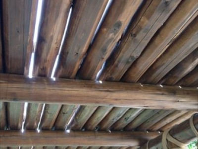 パーゴラは、ゴツゴツとした感じを活かした自然丸太を柱に使っており、野生的な空間を演出しています。