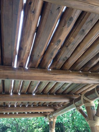 パーゴラは、ゴツゴツとした感じを活かした自然丸太を柱に使っており、野生的な空間を演出しています。