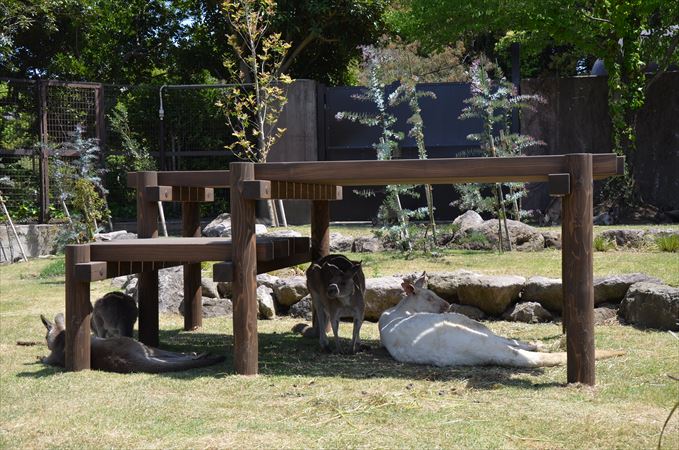 カンガルーの展示場内を歩いて見学できるように整備されており、テーブルの下で休むカンガルー達を間近に見学できます。