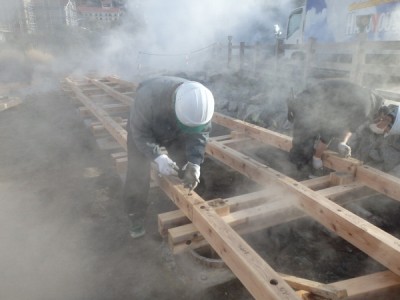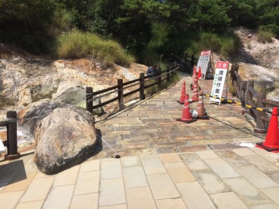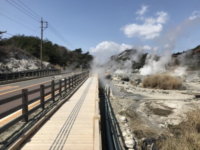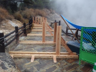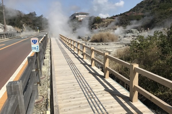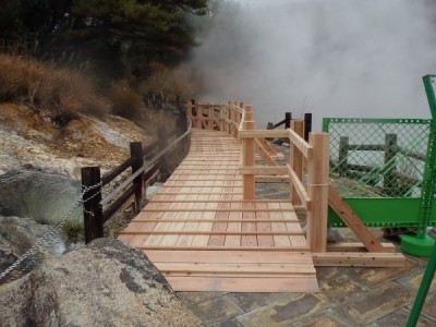 地獄温泉は、雲仙温泉の目玉となる観光名所です。30あまりの地獄から構成されており、雲仙道路脇から清七地獄を眺める遊歩道、お糸地獄そばの据置木道を納入しました。