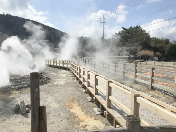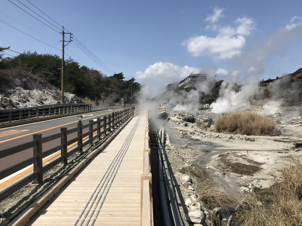 地獄温泉は、雲仙温泉の目玉となる観光名所です。30あまりの地獄から構成されており、雲仙道路脇から清七地獄を眺める遊歩道、お糸地獄そばの据置木道を納入しました。