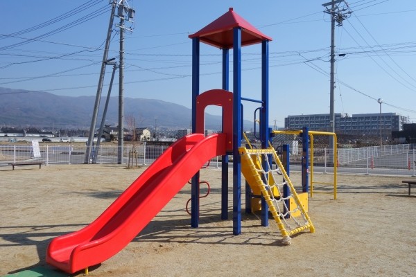 土地区画整理事業による分譲住宅地にできた公園に鋼製遊具と健康器具を納入しました。赤い屋根がシンボリックな遊具です。本体はスチール亜鉛メッキ処理品、床板には合成木材Rexy-woodを使用しています。