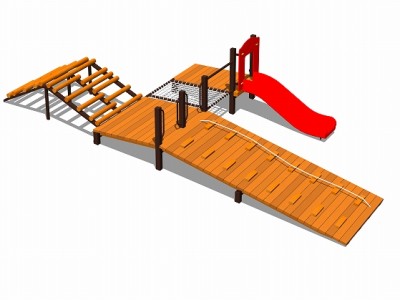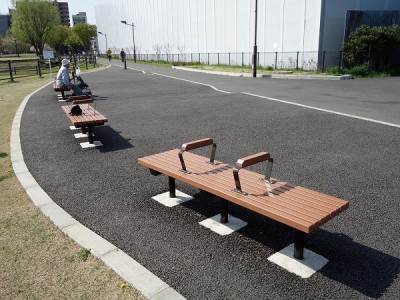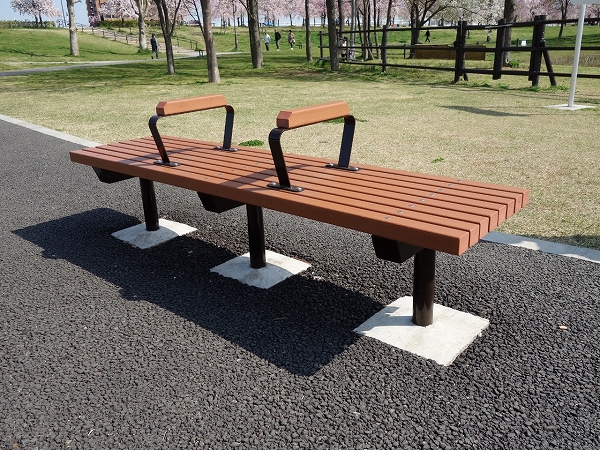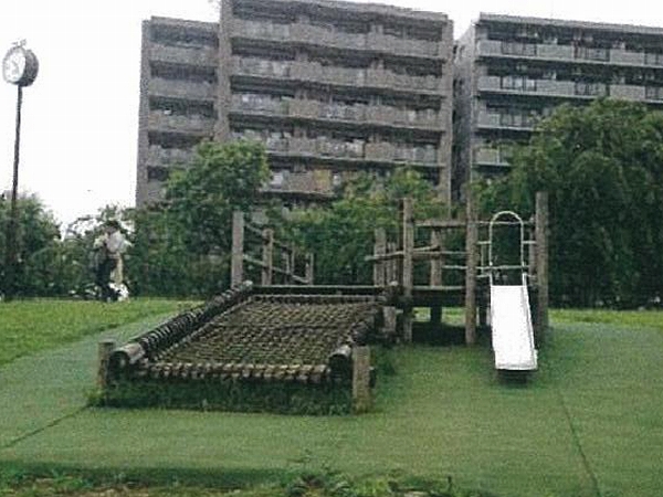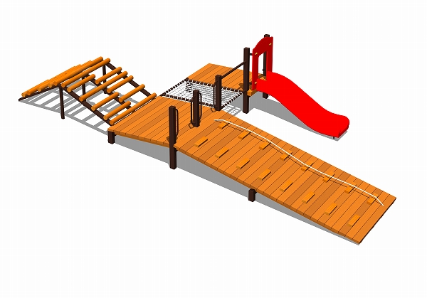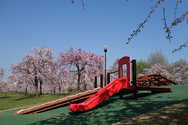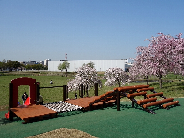 桜や水辺環境が楽しめる都会のオアシス尾久の原公園の劣化した木製遊具に代わり、柱に鋼材を使用した木製遊具「テツモク遊具」でリニューアルしました。斜面地を活かした遊具です。
