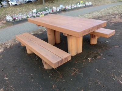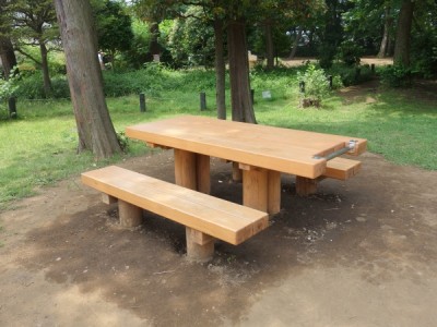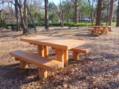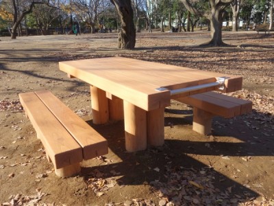 杉並区様ではその一部を木材利用の一環として、公園の野外卓やいこいの森の看板を整備しており、当社で納入いたしました。