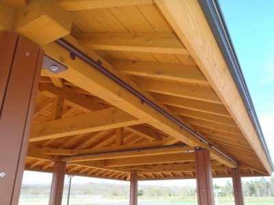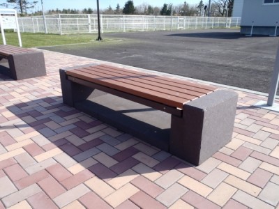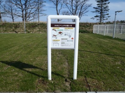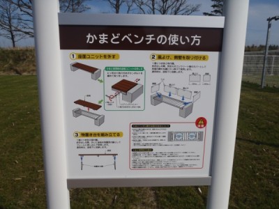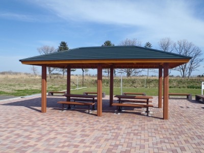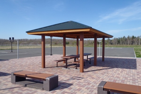 その防災広場の一画に、災害時にテントをかけて救護室などにできる「防災あずまや」、災害時にかまどとして使用できる「かまどベンチ」を納入しました。