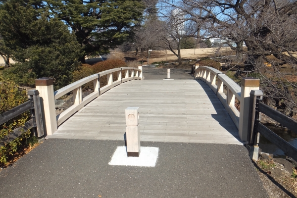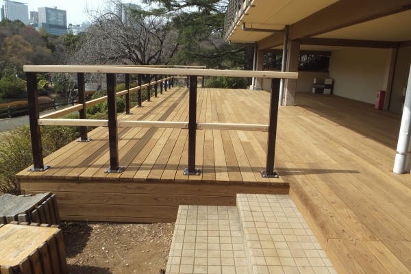 新宿御苑は皇室の庭園として造られましたが、戦後、国民公園となり、多くの利用者が訪れています。園内には、様々な木製施設がありますが、当社でも木橋やデッキ、橋の高欄などのリニューアルを行なっています。木橋は既存の鋼桁を再利用、デッキは既存の建築物にあわせるなど、既存構造物にあわせた設計、製造を行なっています。