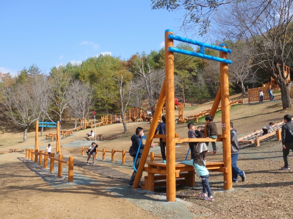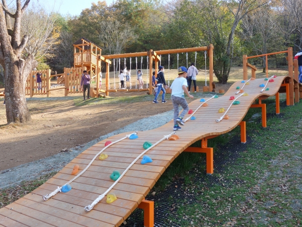 京都府立丹波自然運動公園は京都府京丹波町にある公園でその名の通り、緑豊かな自然を楽しんだり、各種スポーツが楽しんだりできる運動場のある公園です。その南エリアの斜面地に木製遊具を納入しました。公園のコンセプトにもあった、自然体験と運動を楽しめる木製アスレチックが連続したコンビ遊具です。