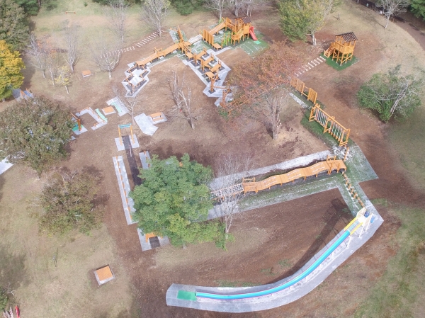 斜面アスレチックコンビ、グリッサンドすべり台、うんてい、ぶらんこ、ターザンロープなど様々な遊具に加え、野外卓やベンチといった休憩施設も納入しました。