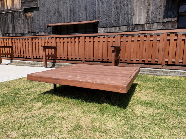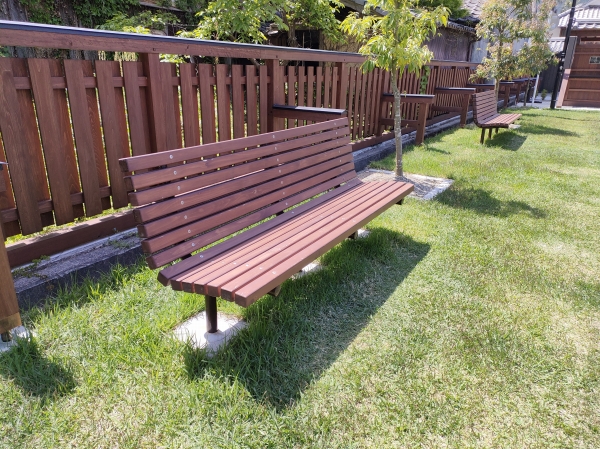 休憩スポットである中町広場の整備にあたり、木製のサイン、車止め、板塀、ベンチを納入しました。