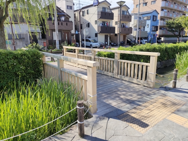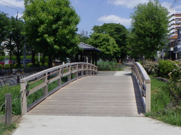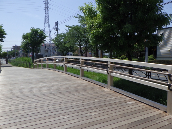 東京都葛飾区の曳舟川親水公園にかかる二つの木橋の改修を行ないました。曳舟川は江戸時代に農業のために整備された葛西用水の別名です。水をテーマに整備された南北3kmにわたる公園で、子どもたちが水遊びをすることもでき、親水性の高い空間となっています。歴史と親水性をもつ空間演出に木の橋が一役買っています。