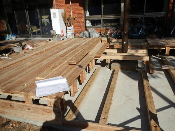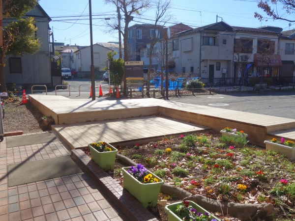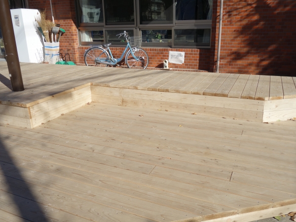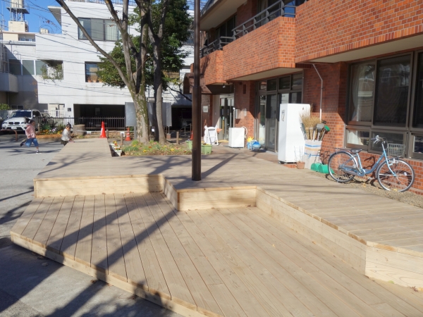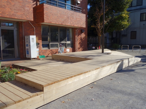 木製デッキは区民ひろば西巣鴨第一とも隣接しており、公園と区民ひろばを接続する役割を果たしています。デッキは段々デッキになっており、人々が自分たちに適した場所で腰掛けて休憩できるようになっています。