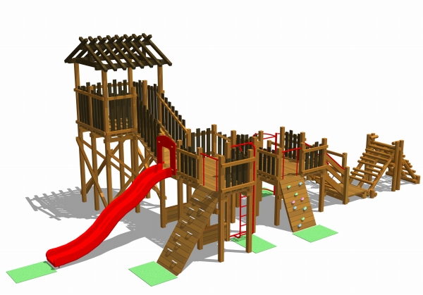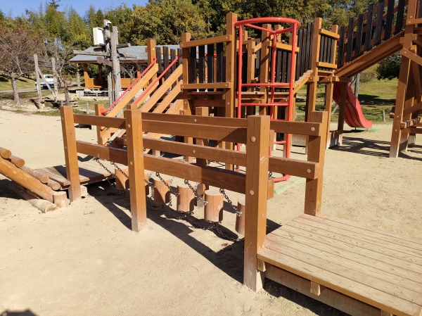 階層状になったデッキに様々な登はん遊具やすべり台などがついており、丸太山越えやゆらゆら丸太などのアスレチック的な要素もあります。様々な遊びが楽しめる遊具になっています。