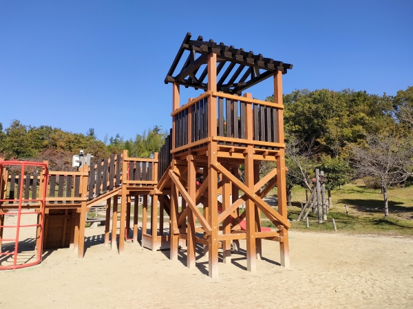 また、遊具のシンボルとして、床高2.8mの展望スペースがあり、遊具広場や周囲の景観を楽しむことができます。トリデ風のデザインが子どもたちの冒険心をくすぐります。
