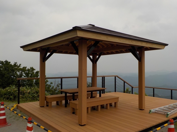 大山隠岐国立公園内の三瓶山は6つの峰が連なる山です。この峰の一つ大平山にある東の原展望テラスに東屋、サイン、ベンチを納入しました。展望テラスには登山だけでなく、東の原から観光リフトで上がることもできます。東屋は合成木材の化粧柱に木製の小屋組みで構成。サイン、ベンチは島根県産杉材(ペンタキュアECO30加圧注入保存処理材)を使っています。
