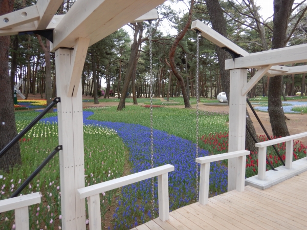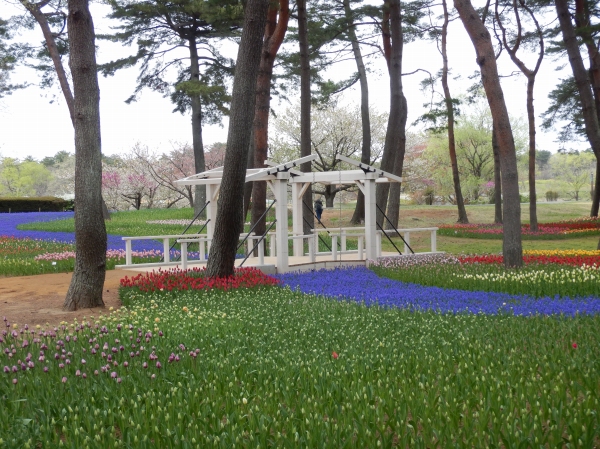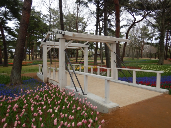 国営ひたち海浜公園のたまごの森エリアにオランダの跳ね橋風のデッキを納入しました。一見、川にかかる橋のように見えますが、公園内にあるモニュメント風のデッキです。チューリップが咲く季節には、青いチューリップが川の流れのように見えます。実際の跳ね橋のような可動はしませんが、オランダにあるようなデザインにこだわっています。