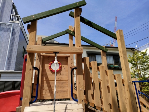 戸越南公園は東京都品川区にある公園です。遊具などの老朽化に伴い、公園の改修工事が行われました。この改修工事にあたり、当社で多摩産材を使った木製遊具を納入しました。