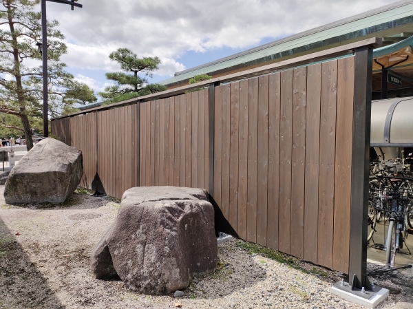 宮島に渡るフェリーの旅客ターミナル脇の自転車置き場を隠す目隠しに当社の木塀を納入しました。木塀の柱は鋼材を使用し、木材は国産杉材にペンタキュアECO30を加圧注入処理したものを使用しています。