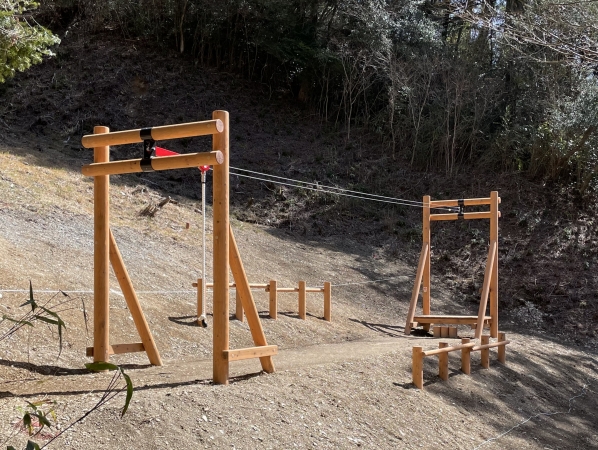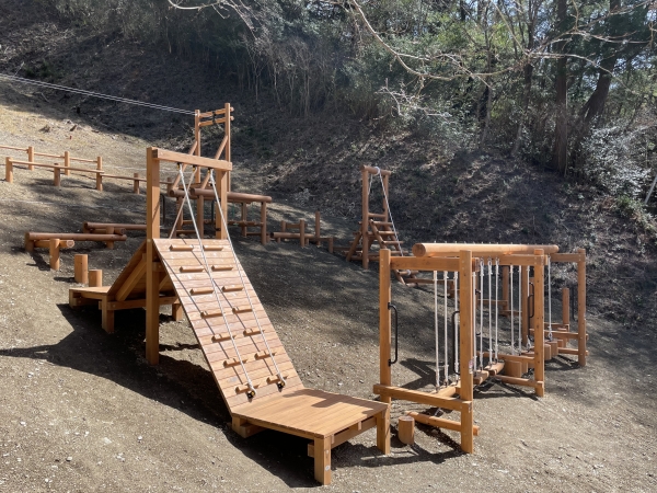 いの町にあるグリーンパークほどのの斜面地に、木製遊具を納入させていただきました。アスレチック遊具を連続させて回遊機能をもたせた遊具です。ターザンロープ、ぶらんこといった人気遊具も配置しました。キャンプ施設に隣接しており、森林を楽しむ子ども達の遊び場になっています。