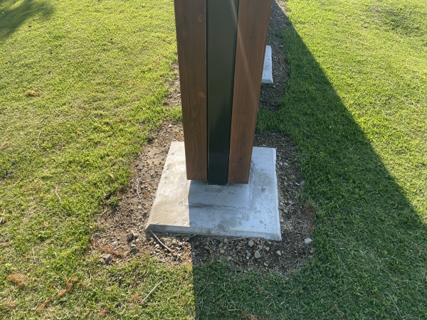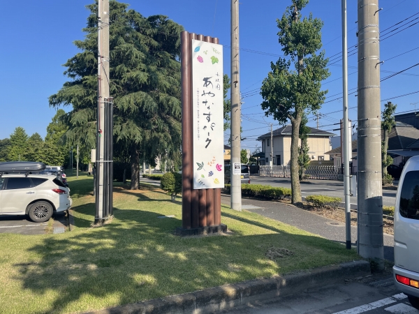 群馬県伊勢崎市にある赤松園あやなすパークには、ちびっ子噴水広場と中央噴水ミストの2種類の噴水がある公園で、今の猛暑の時期にも人が賑わう公園です。その公園の出入口に木製のエントランスサインを当社で納入しました。