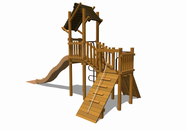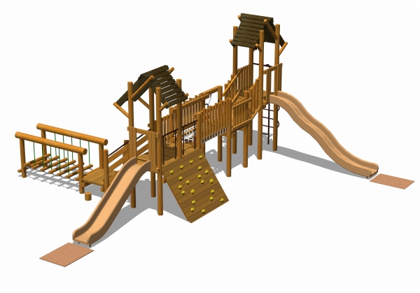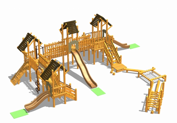 当社で人気の複合遊具「もくもくトリデ」の丸太柱タイプです。丸太を使うことでよりワイルドで冒険心をくすぐるデザインとなっています。林間部のアスレチック遊具とのデザインの相性にもすぐれた遊具です。大、中、小の基本プランに加え、ご予算、面積にあわせたオリジナルプランも可能です。