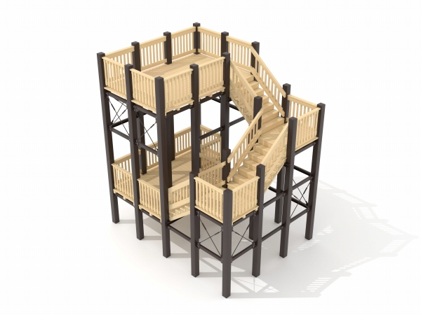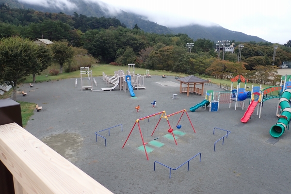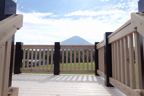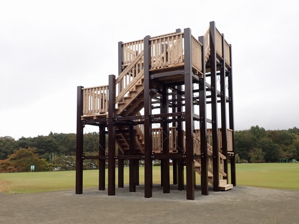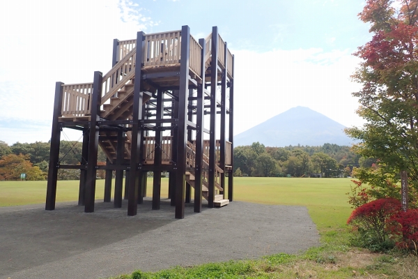 山梨県鳴沢村にある鳴沢活き活き広場は、正面に富士山が見える広大な芝生広場と遊具エリアから成る憩いのスペースです。この広場に富士山を眺めることのできる展望デッキを当社で納入しました。主構造は鉄骨構造、床板と柵に木材を使用したハイブリッド構造の床高5.8mの展望台です。