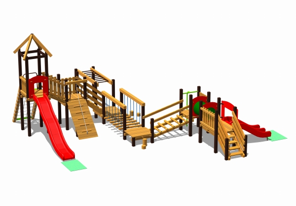 シンボル性の高い屋根フレームが特徴的なコンビネーション遊具は、要構造部である柱には防錆処理を施したスチールを使用し、耐久性を高めたテツモク遊具です。
