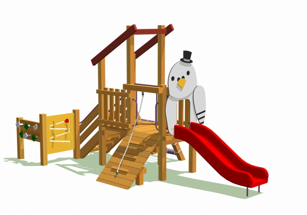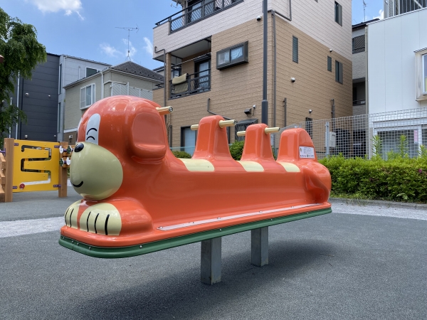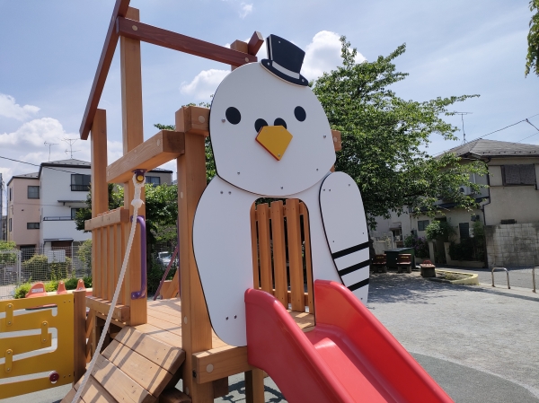 荒川区の住宅地内にある一本松児童遊園に、複合遊具と3人乗りのロッキング遊具を納入いたしました。この公園は、ハトが多く集まることから「ハト公園」の愛称で親しまれています。そのため、複合遊具にはハトをモチーフにしたデザインを取り入れています。ハトとクローバーのパネルがついた「ハト押しバンバン」は両側から二人でパネルを早押しして遊びます。車椅子のお子さんなども楽しく遊べるインクルーブ対応型のアイテムです。また、すべり台の入口には樹脂パネルを数枚重ねて製作したインパクトのあるハトのパネルが設置されています。