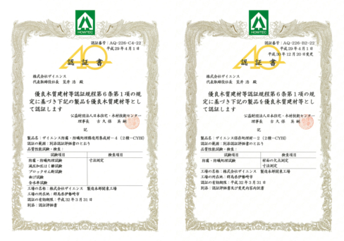 - 薬剤浸潤部の常時呈色が可能で、長期の有効性が説明できる深浸潤処理用新薬剤「サンプレザーOPエース(CYBI)」のAQ認証を取得。住宅向け土台製品であるOPドライスケヤー等の保存処理剤として使用を開始。また、従来の樹種に加え、難注入樹種であるSPF材でもAQ2種追加認証を取得。加えて、非住宅木造建築(構造計算)需要に呼応するため、製材のJAS「機械等級区分構造用製材」を基材に用いたAQ認証を加える。