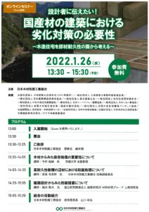 1月26日に開催され大好評だったWEBセミナー「設計者に伝えたい! 国産材の建築における劣化対策の必要性~木造住宅を部材耐久性の面から考える~」の動画が、主催の日本木材防腐工業組合のHPで配信されています。