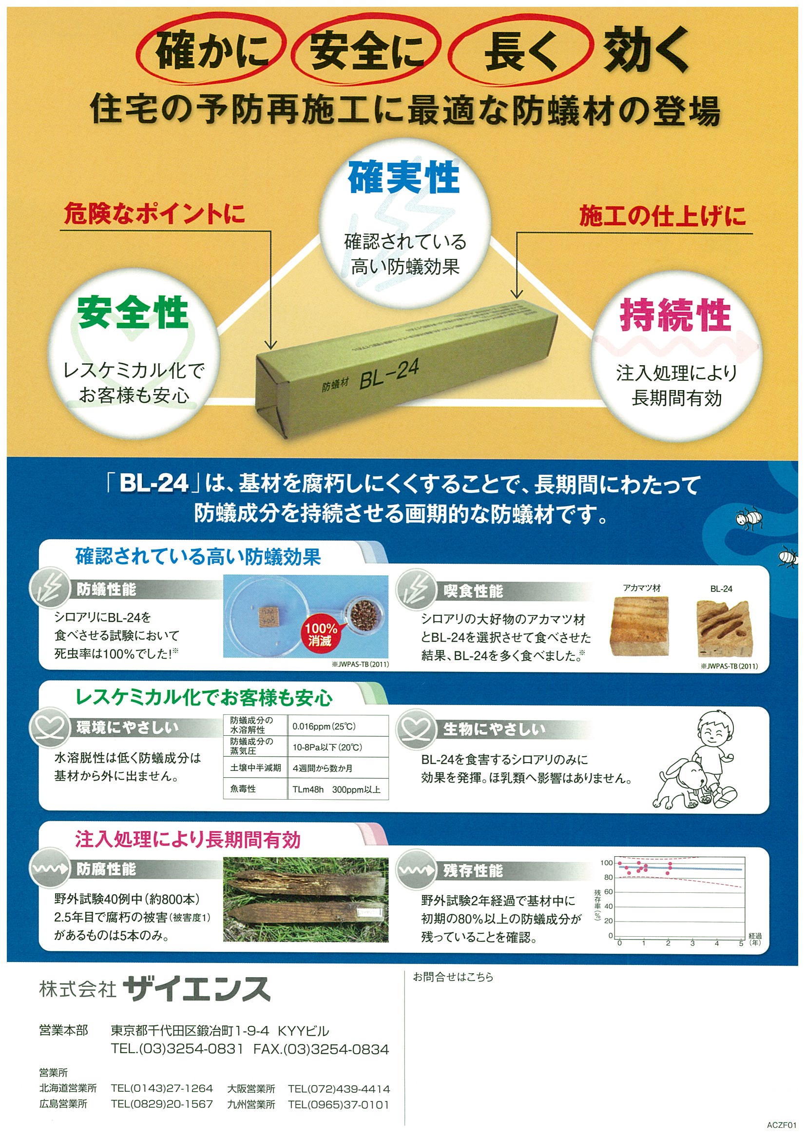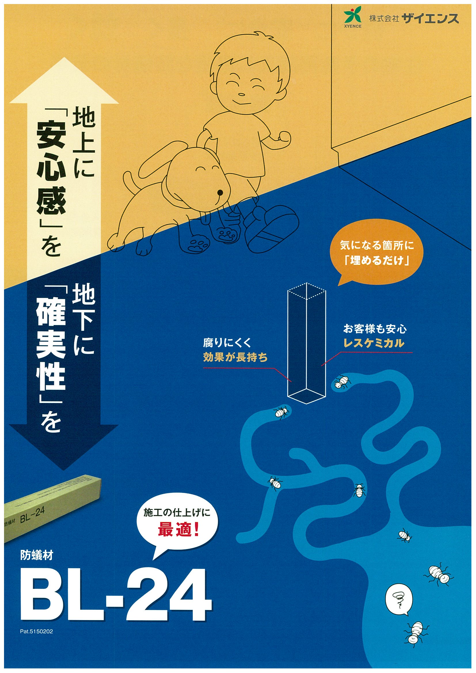 お知らせ News TOPお知らせ開発/薬剤/防蟻ホームセンター取扱商品 防蟻材「BL-24」について(営業本部) NEWS お知らせ 2017.12.27 開発/薬剤/防蟻 ホームセンター取扱商品 防蟻材「BL-24」について(営業本部) 防蟻材「BL-24」が大手ホームセンターにて好評を得ています。同商品は、一般の方でも手軽に施工できるシロアリ予防材です。安全性、持続性、効果の「見える化」に応えた商品です。 2017.12.18 住宅/防腐木材 サンプレザーOPエースで深浸潤処理を施したJAS機械等級桧土台について(広島営業所) 2018.01.11 エクステリア 施工実績更新しました(1月の特集「リニューアル」)
