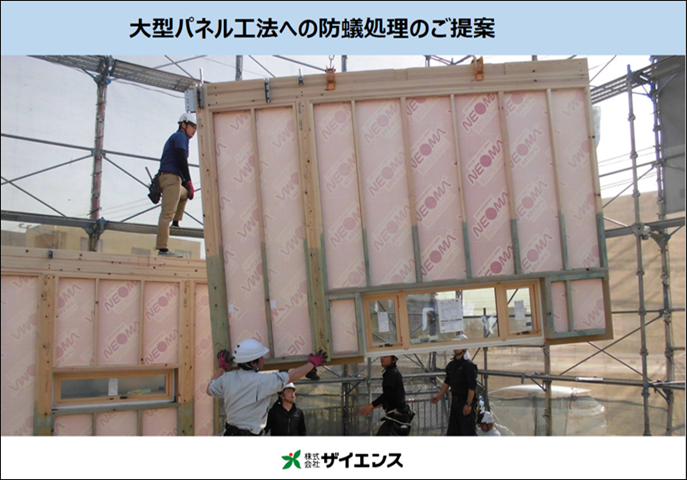 工期短縮、現場省力化に最適な大型パネル生産パートナー協会様の大型パネル工法(構造材・面材・断熱材・サッシをあらかじめ工場で一体化させ、現場で組み立てる工法)に弊社の防蟻ハイブリッド工法が採用されました。液剤を使用しないため、現場美化にも貢献、大型パネルとの組み合わせで10年の防蟻保証も可能です。是非お問合せ下さい。