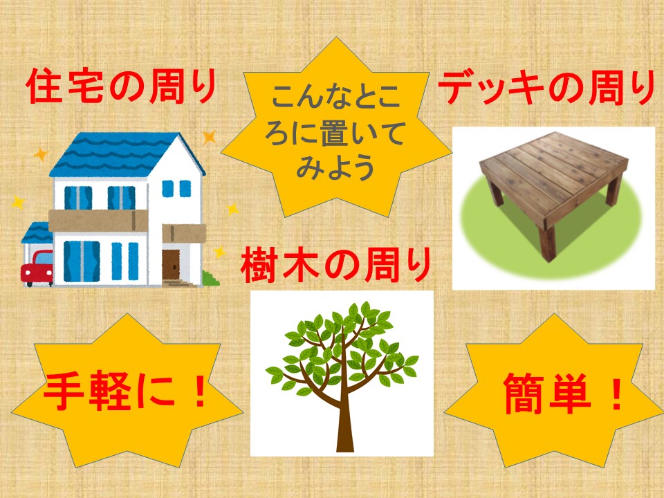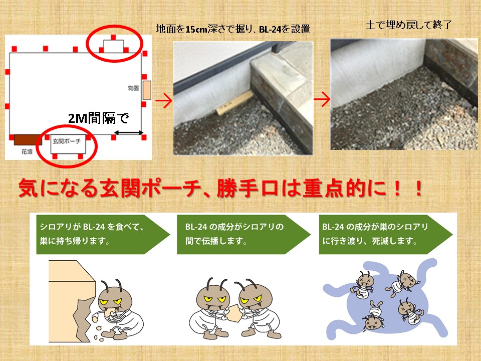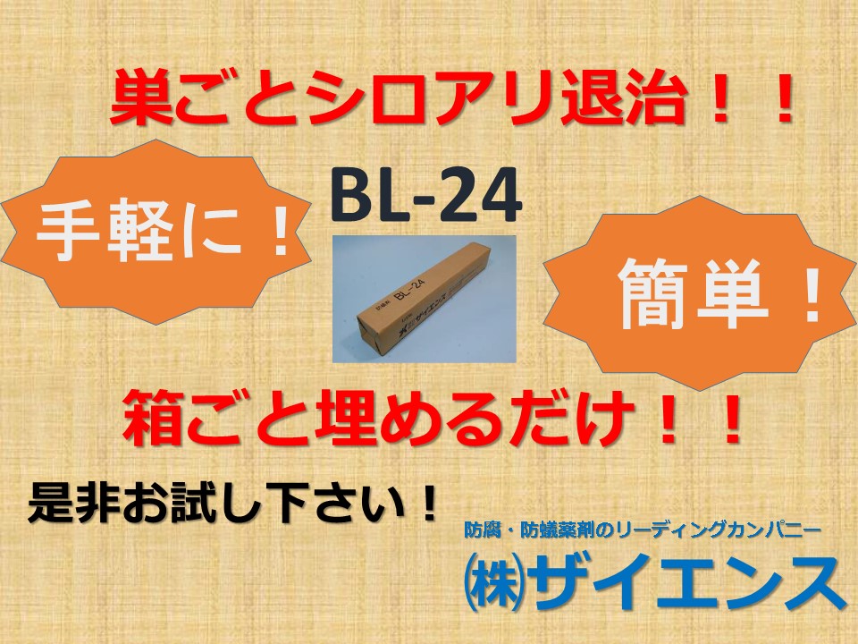 お知らせ News TOPお知らせ開発/薬剤/防蟻手軽に! 簡単! 埋めるだけ! シロアリシーズンの到来と共に「BL-24」の出荷が最盛期を迎えています。 NEWS お知らせ 2019.06.14 開発/薬剤/防蟻 手軽に! 簡単! 埋めるだけ! シロアリシーズンの到来と共に「BL-24」の出荷が最盛期を迎えています。 シロアリシーズンの到来とともに、防蟻材BL-24の出荷が最盛期を迎えています。「BL-24」はシロアリが好むように加工した木材を基材としています。住宅や樹木、デッキ等の足回りに埋めるだけでシロアリを巣ごと退治することができます。人やペットへの安全性は高く、水溶脱性が低いため、防蟻成分が基材から外に出ることはありません。大切な建物や樹木を守るため、手軽に!簡単!箱ごと埋める「BL-24」を是非、お試しください。 2019.06.04 エクステリア 施工実績更新しました(6月の特集「サイン」) 2019.06.21 開発/薬剤/防蟻 第30回木材保存技術奨励賞を受賞しました