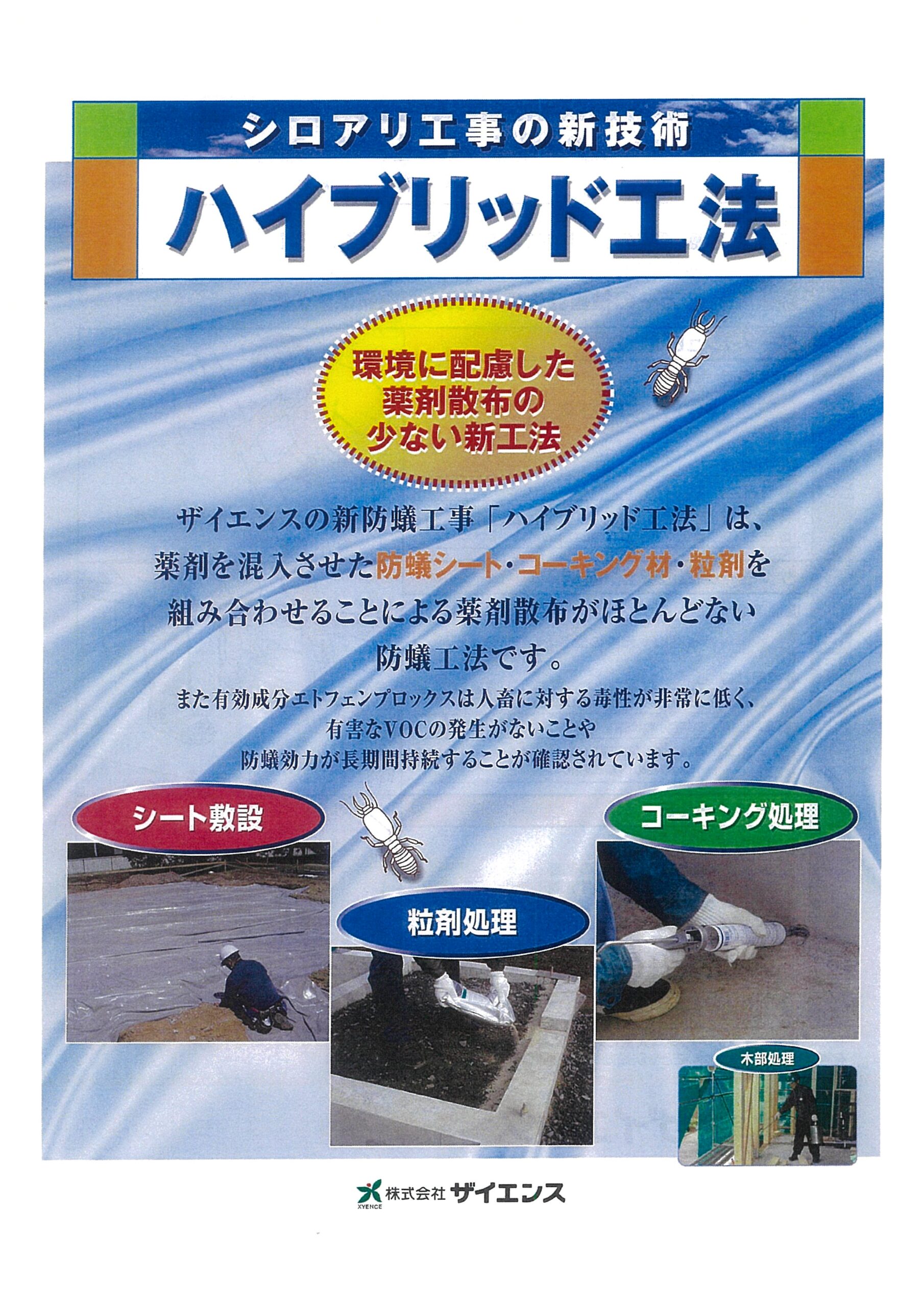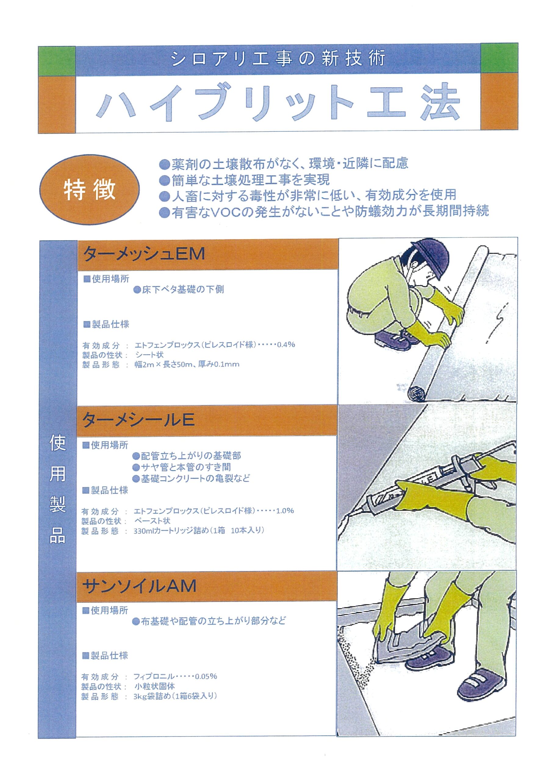 お知らせ News TOPお知らせ開発/薬剤/防蟻新築シロアリ予防工事における新工法「ハイブリッド工法」のご案内 NEWS お知らせ 2021.09.09 開発/薬剤/防蟻 新築シロアリ予防工事における新工法「ハイブリッド工法」のご案内 新工法であるハイブリッド工法は、水で薄めた薬剤散布の代わりに防蟻効果の有る防湿シート及びシール剤、粒剤を使用し、土壌面にシロアリに対するバリアを形成します。液剤散布に比べ薬剤の飛散が少ないので、より環境負荷が少ない工法と言えます。また、基礎業者様や設備業者様での施工も可能ですので、工程の簡略化が期待できます。 防蟻シート敷設 粒剤処理 シール剤 2021.09.04 エクステリア ストレッチ運動を楽しむ健康器具。チチヤス大野ふれあいパーク(広島県) 2021.09.14 エクステリア 筋力維持、ストレッチができる8点の健康器具。愛宕フクロウ公園(山口県)