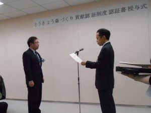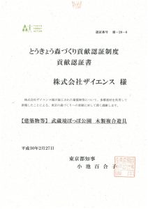 とうきょう森づくり貢献認証制度とは東京都が実施する認証制度で、森づくり活動や多摩産材を利用した企業や都民等に対し、東京の森づくりへの貢献と、二酸化炭素吸収量及び二酸化炭素固定量を認証します。本制度は4つの制度から構成されており、その中の「建築物等による二酸化炭素固定量認証制度」において武蔵境ぽっぽ公園に納品させていただいた「木製複合遊具」が認証されました。