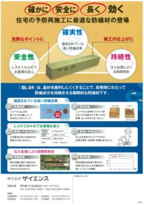 お知らせ News TOPお知らせ開発/薬剤/防蟻防蟻材BL-24によるシロアリの駆除効果について NEWS お知らせ 2021.05.10 開発/薬剤/防蟻 防蟻材BL-24によるシロアリの駆除効果について 防蟻材「BL-24」は地中に埋めるだけで、シロアリに対する殺虫効果を発揮する画期的なシロアリ予防・駆除製品です。大量のシロアリが発生した切り株周辺に「BL-24」を埋設し、約9か月後に点検を行ったところ、食痕と数頭のシロアリが確認されました。今後暑さとともに、シロアリの活性が高まり、十分な駆除効果が発揮されます。防蟻材「BL-24」は、建物やデッキなどの周辺部に埋設するだけで、シロアリの巣を丸ごと駆除することができます。 2021.05.09 エクステリア 森の中で楽しむ木製遊具の事例。三条市トリムの森(新潟県) 2021.05.13 エクステリア 鋼製柱と木材を組み合わせたアスレチックの事例。袖ヶ浦駅海側近隣公園(千葉県)