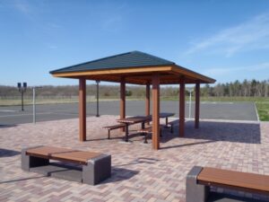 防災拠点に特注サイズ防災あずまやの事例。日高町富川東防災公園(北海道)