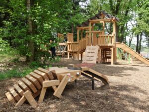 森の中で楽しむ木製遊具の事例。三条市トリムの森(新潟県)