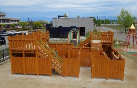 今回ご紹介するのは「袖ヶ浦駅海側近隣公園」、駅近くの住宅街に鋼製柱と木材を組み合わせたテツモク遊具を納入した事例です。