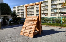 今回ご紹介するのは、立田山憩いの森です。熊本県熊本市の市街地に隣接している、市民が豊かな自然を楽しむことができる空間に木製遊具を納入しました。メインの児童用の連続型アスレチック遊具を中心に、幼児用の機関車遊具、ターザンロープ、棒渡りを納入しています。