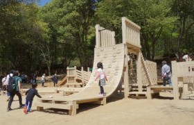 住宅内の公園に木の温もりある遊具。霞台第一住宅児童公園(東京都)
