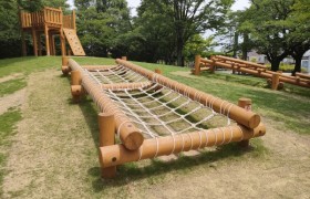 今回、紹介するのは宮城県石巻市にある雄勝多目的広場です。雄勝多目的広場は東日本大震災で被害を受けた宮城県石巻市の石巻雄勝地区の雄勝ガーデンパーク内に新しく整備された公園です。この公園整備にあたり、当社の木製アスレチック遊具を7基納入しました。