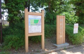 公園の来訪者に入口を伝える木製エントランスサイン。あやなすパーク(群馬県)