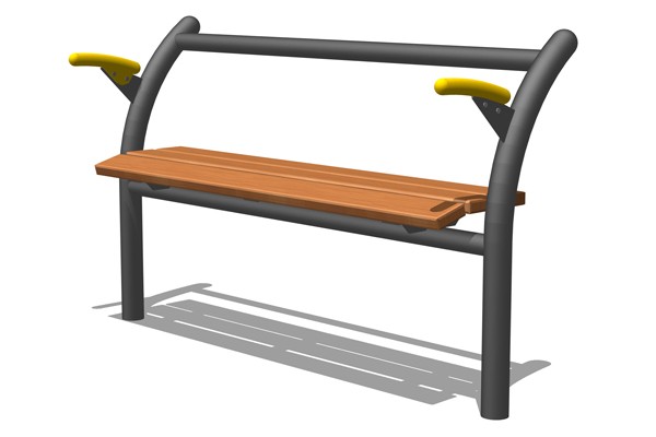 ちょっと休む。すっと立てる。それがスクットです。体力の衰えた人にも立ち座りしやすい短時間の休息を目的としたベンチです。