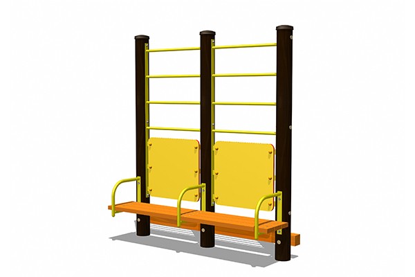 高齢者向けの簡単な運動ができる健康器具です。ベンチに座って足あげをしたり、裏側に立ってかかとの上げ下げをしたりできます。二人でできます。